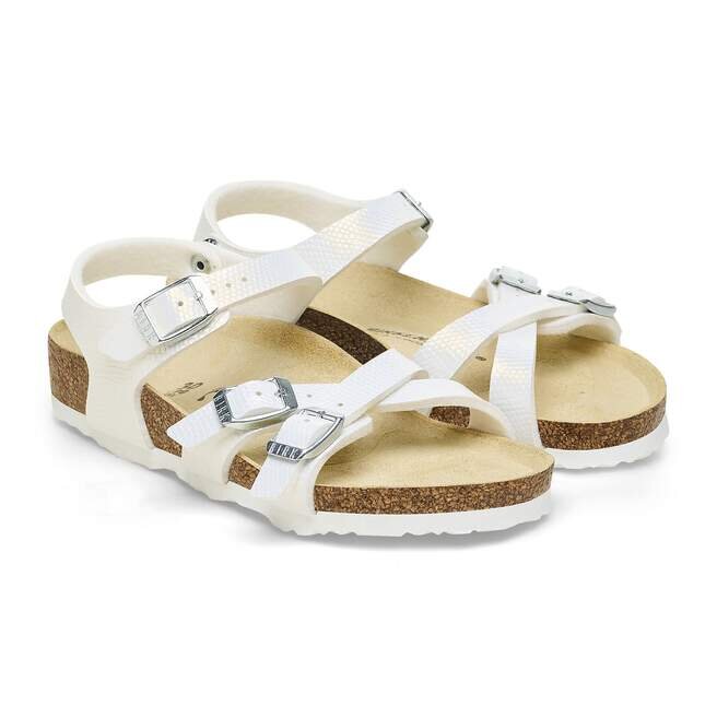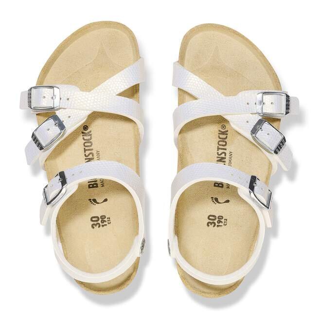 Kumba-sandalen för barn, polerad för att fånga solens strålar. Präglad Birko-Flor® ger glans åt deras stil, med ankelband för extra säkerhet och en passform som sitter precis rätt. Komplett med en Original Footbed från Birkenstock som stöder dem under dagarna fyllda av lek.
