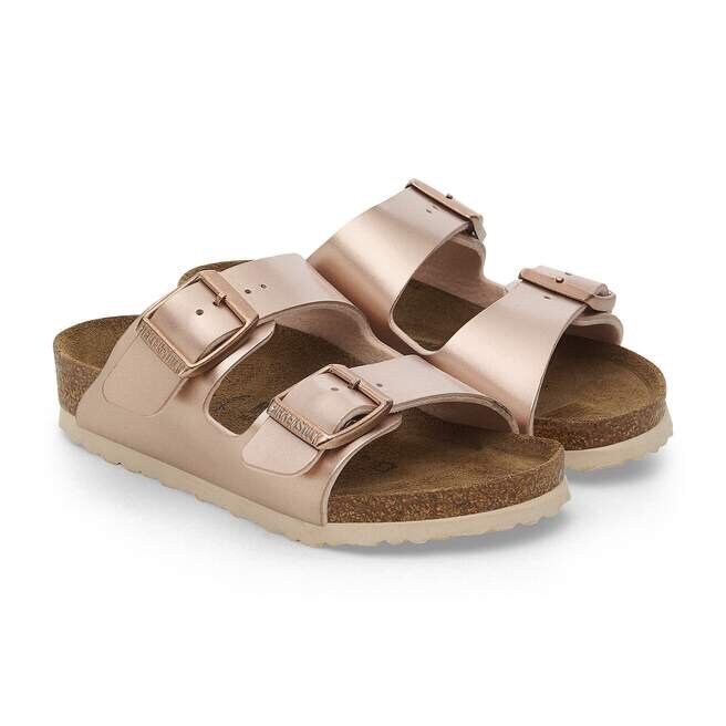 Den tidlösa ikonen, i mindre storlek och uppfräschad speciellt för barn. En elektrisk metallic-finish förvandlar den klassiska looken till deras favoritmodell som syns, utrustad med ton-i-ton-spännen och en matchande yttersula. Komplett med klassiska Birkenstock-designelement, som justerbara spännen och en konturerad fotbädd i kork-latex som håller små fötter bekväma när de är i rörelse.