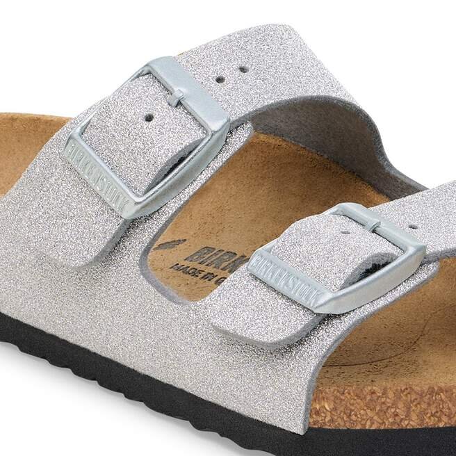 Birkenstock Arizona är en äkta klassiker som i årtionden har glatt sina bärare med sin tidlösa design. Modellen med två remmar passar barns fötter perfekt – även under livliga lekar! Denna version är tillverkad av ett syntetiskt material med en TPU-beläggning som använder speciell nanoteknik för att skapa en glittrande effekt. Denna teknik säkerställer att inget glitterdamm faller av.