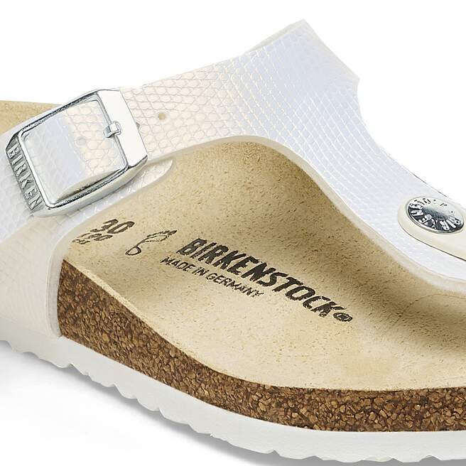 Birkenstock Gizeh är en äkta klassiker som kombinerar optimalt grepp med trendig design för att verkligen dra blickarna till sig i skolan. Denna version har ett glänsande ödlemönster och utstrålar elegans och en touch av extravagans tack vare den iriserande metallfolien och reptilskinnslooken. Inspirerad av naturen, ingen sko ser ut eller känns precis som en annan. Överdelen är tillverkad av det hudvänliga, slitstarka syntetmaterialet Birko-Flor®, som har präglas.