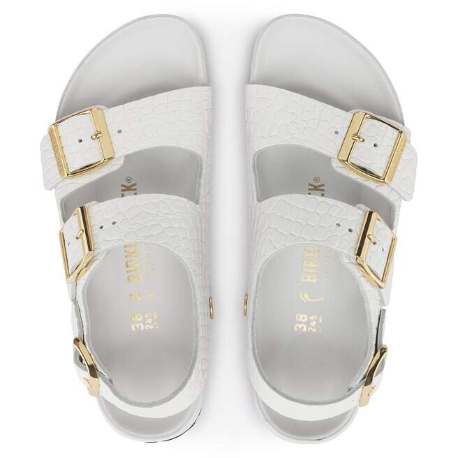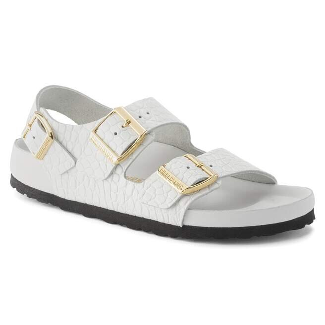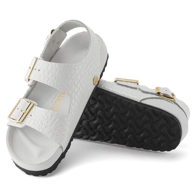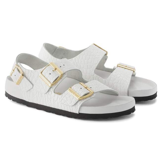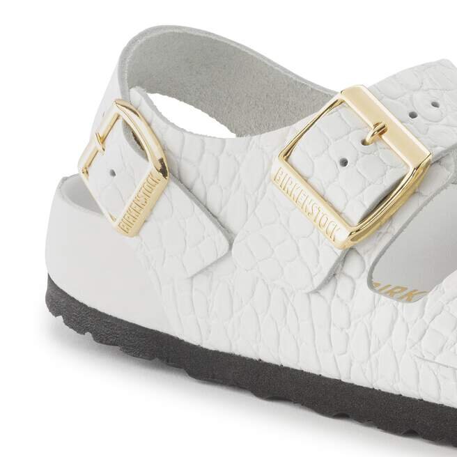 Birkenstock Milano har nu ett utseende och en känsla av reptilläder samt en kompakt design med vristrem. Metallspännena är individuellt justerbara med färgkoordinerade detaljer. Den utsökta fotbädden är helt fodrad med mjukt Piumato-läder, vilket gör den exceptionellt bekväm. Ovansidan är tillverkad av präglat naturläder.Anatomiskt formad fotbädd i kork och latex; utsökt