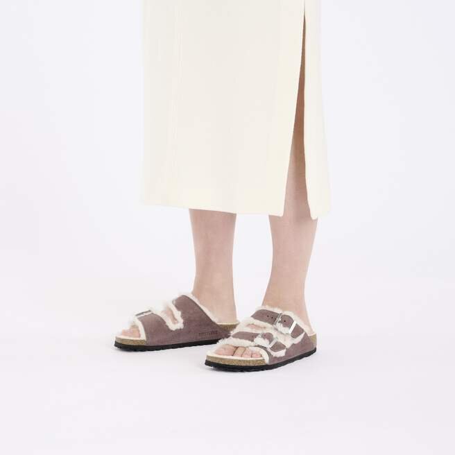 Arizona-sandalen, gjord för att vara mysig under de kallare månaderna. Klassisk mocka ger en sammetslen känsla som fortsätter på insidan. Modellen är helfodrad med äkta fårskinn, ända ner till den ursprungliga konturerade fotbädden. En mjuk, stödjande landning varje gång.