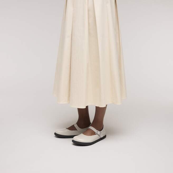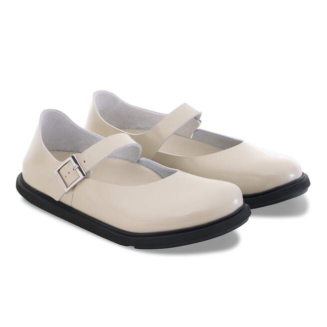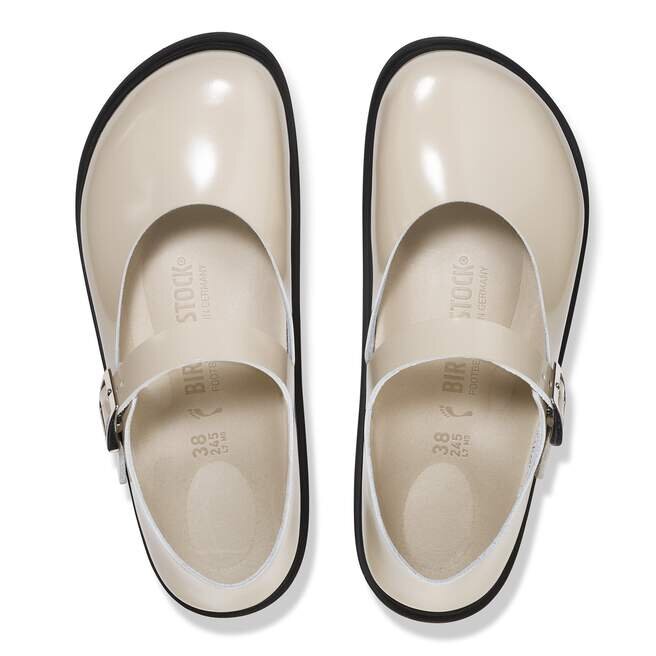Birkenstock Mantova är en tolkning av den klassiska Mary Jane i en rustik och särskilt bekväm version. Modellen har en öppen kant och är ofodrad, vilket framhäver dess naturliga utseende. Denna version har Droplet-spännet, som är helt tillverkat av högkvalitativt zamak i en fyrkantig form. Dess design kombinerar premiumkvalitet med ett modernt, tidlöst utseende. Övre delen är tillverkad av högkvalitativt naturläder med en glansig lackbeläggning.