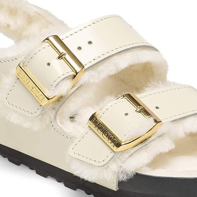 Glansigt läder ger sandalen Milano den perfekta modefinalen, fodrad med äkta shearling för en mjuk känsla som du känner så fort du kliver i den. En justerbar bakrem ger dig extra säkerhet och en passform som sitter precis rätt. Komplett med en original Birkenstock-fotbädd i kork och latex för ultimat stöd hela dagen.