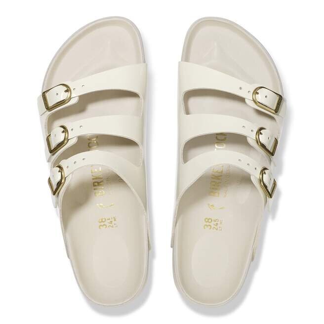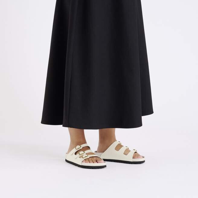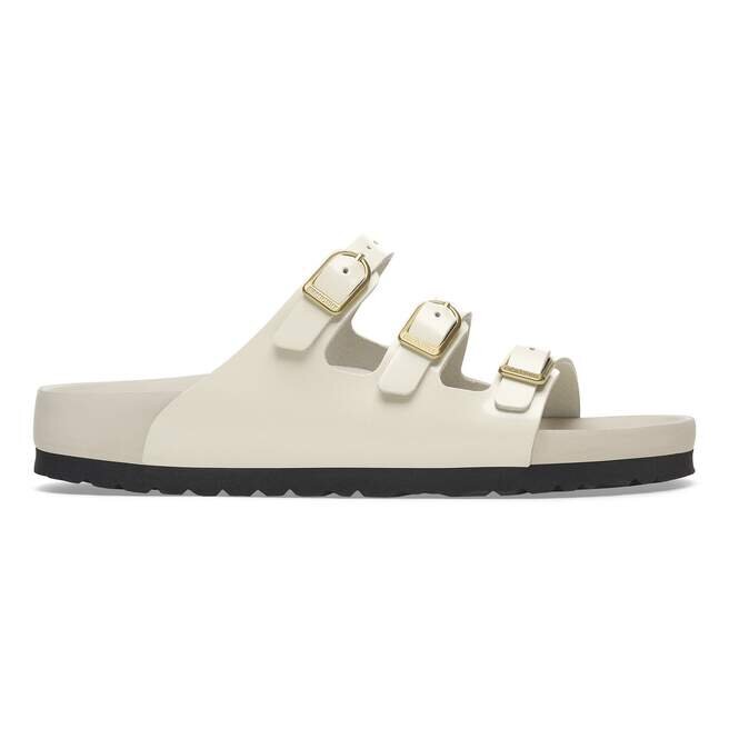 Spotlight riktas mot Florida Sandal. Glansigt läder och glänsande spännen fångar ljuset precis rätt över de tre remmarna. Denna utsökta modell bygger på vår Original Footbed, fodrad med ultramjukt läder för en lyxig landning varje gång.