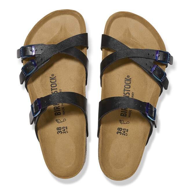 Birkenstock Franca är en elegant sandal med smala korsade remmar. Den imponerande kombinationen av design och bärkomfort gör att modemedvetna kvinnor kan ta sig igenom dagen med elegans och komfort. Här ser vi sandalen med en silkeslen glansig yta. De färgkoordinerade detaljerna fulländar skons sofistikerade utseende. Övre delen är tillverkad av det hudvänliga, slitstarka syntetmaterialet Birko-Flor®.