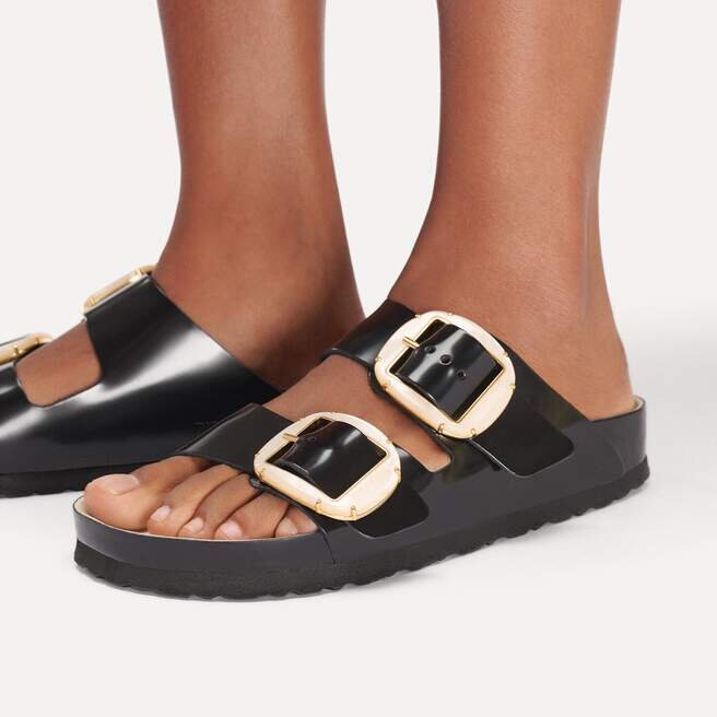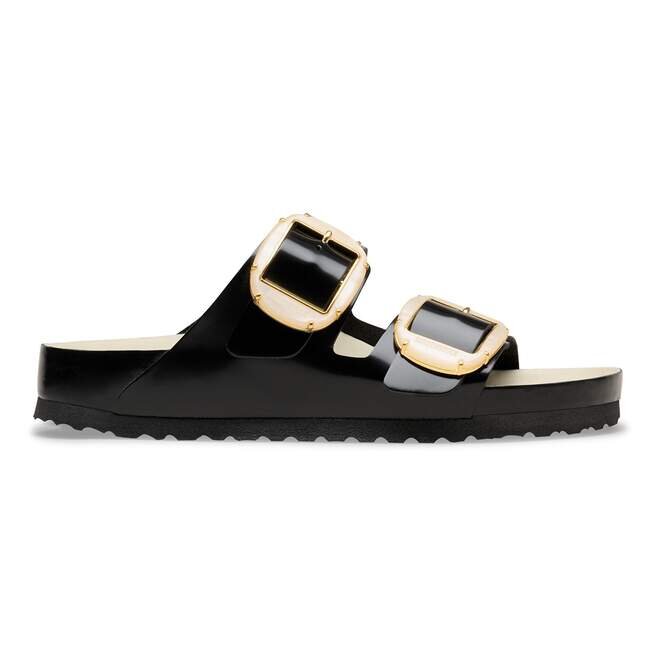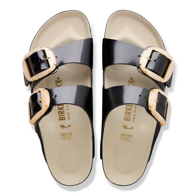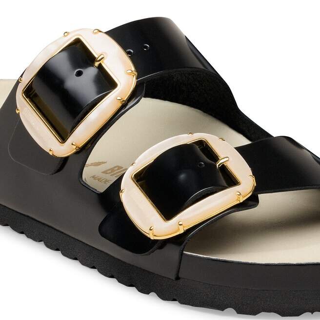 Birkenstock Arizona är en äkta klassiker som har glatt både män och kvinnor i årtionden. Denna enkla sandal med två remmar står för tidlös design och har länge haft kultstatus tack vare sin komfort. Det stora Big Buckle-spännet ger en feminin touch och säkerställer en lyxig look. Med sin glänsande design och fina detaljer i metallpärlor skapar den en stilfull look och blir ett riktigt blickfång. Den utsökta fotbädden är helt fodrad med mjukt Piumato-läder, vilket gör den exceptionellt bekväm. Den färgkoordinerade yttersulan rundar av skons sofistikerade look. Övre delen är tillverkad av högkvalitativt naturläder med en glänsande lackbeläggning.
