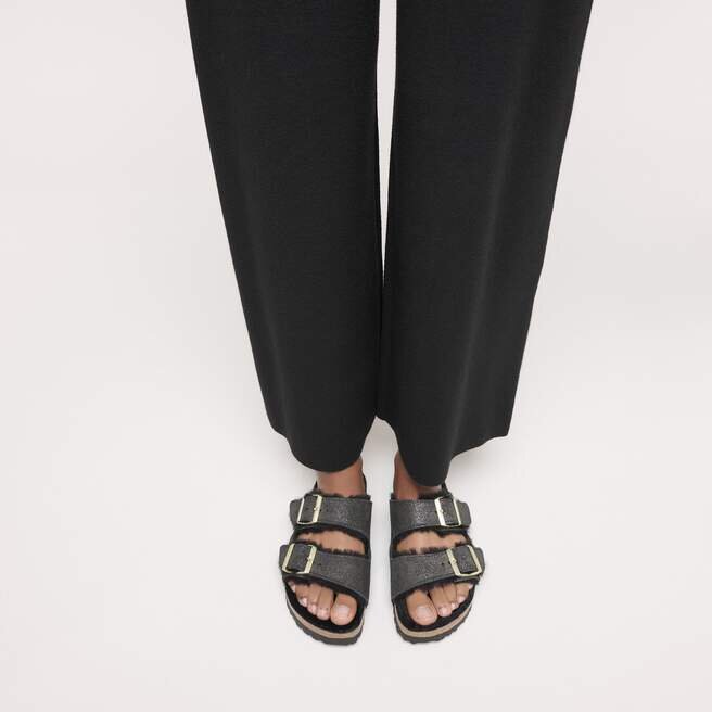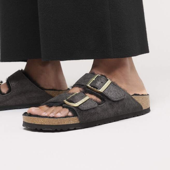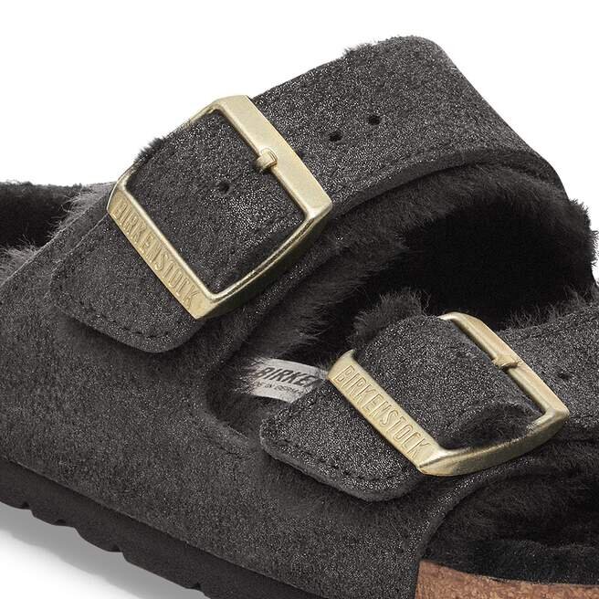 Arizona-sandalen, gjord mysig för de kallare månaderna. Mjukt fodrad med äkta fårskinn, med skimrande mocka som mjukt fångar ljuset. Designad på en originalformad fotbädd för en bekväm landning varje gång.