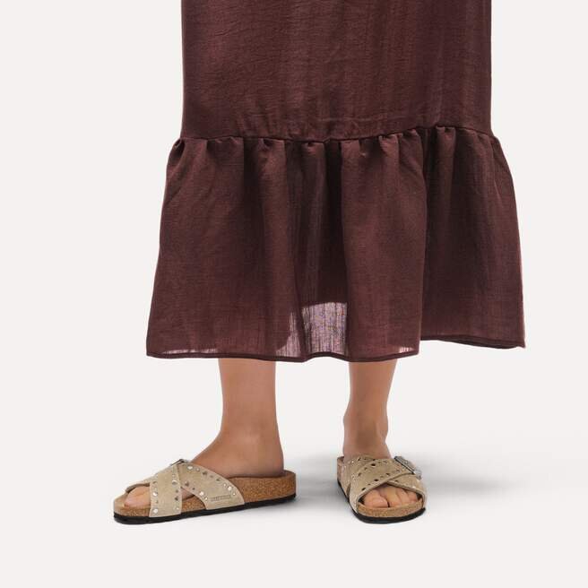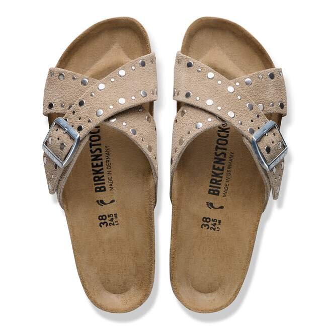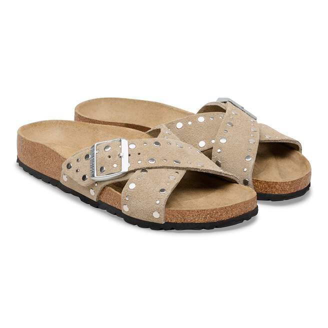 Birkenstock Siena har ett raffinerat utseende. Korsande remmar ger sandalen dess unika och speciella utseende. Denna version har exakt placerade nitar utan baksida som i en avancerad tillverkningsprocess sätts fast ordentligt i lädret utan att gå för djupt, vilket gör dem osynliga när skon bärs. En riktig blickfångare! Överdelen är tillverkad av särskilt mjukt mocka som omsluter foten som en andra hud.