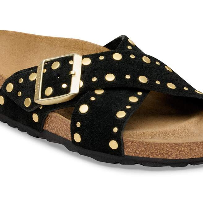 Birkenstock Siena har ett raffinerat utseende. Korsande remmar ger sandalen dess unika och speciella utseende. Denna version har exakt placerade nitar utan baksida som i en avancerad tillverkningsprocess sätts fast ordentligt i lädret utan att gå för djupt, vilket gör dem osynliga när skon bärs. En riktig blickfångare! Överdelen är tillverkad av särskilt mjukt mocka som omsluter foten som en andra hud.