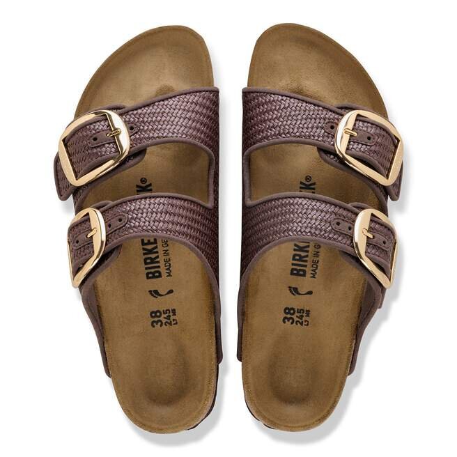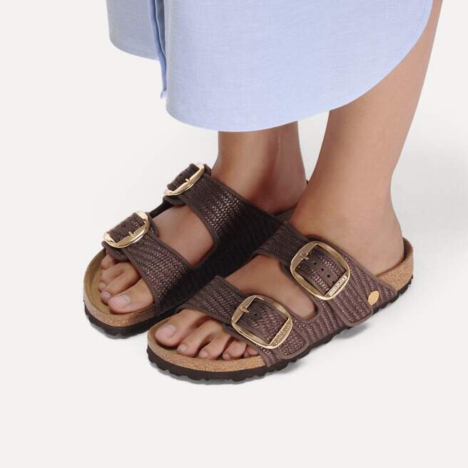 Raffia-stil, extra polerad. Arizona-sandalen ger det vävda utseendet en ny ram med ton-i-ton-kantband och överdimensionerade, glänsande spännen. Allt på en konturerad fotbädd som verkligen stöder din stil.
