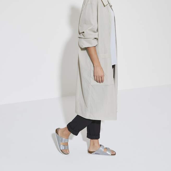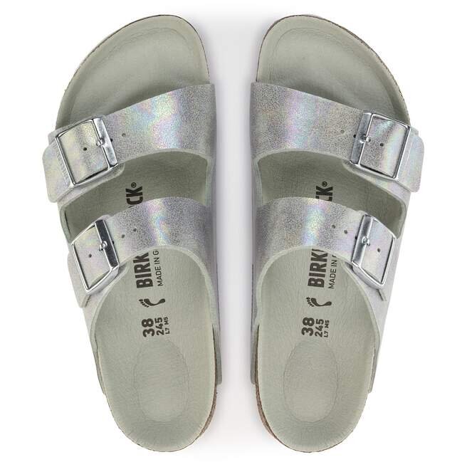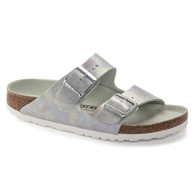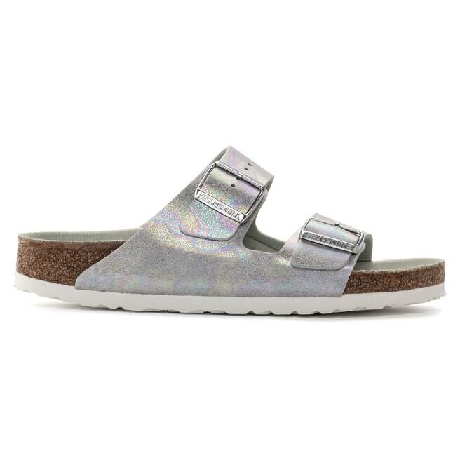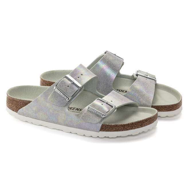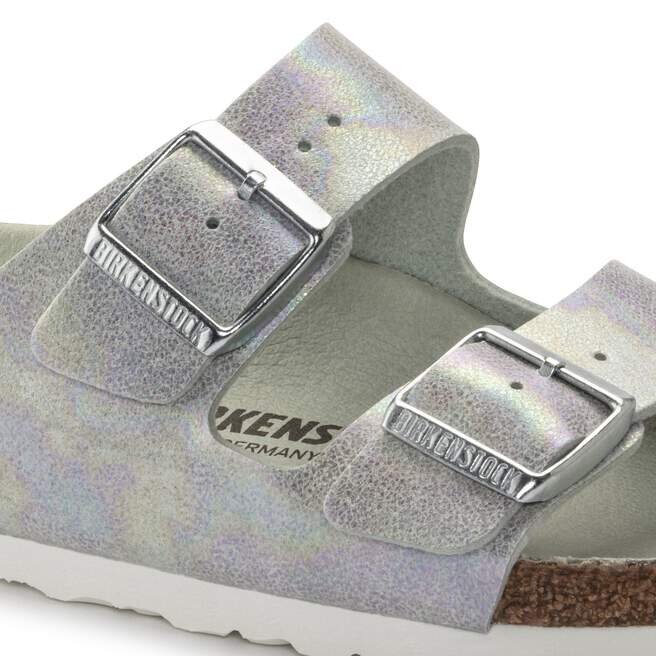 Den legendariska designen med två remmar från Birkenstock – Arizona, nu i veganskt material. Ikonisk stil med den karakteristiska komforten från Birkenstocks fotbädd. Denna version har en iriserande, silkeslen glans med mångfärgat skimmer. Ovansidan är tillverkad av hudvänlig mikrofiber.