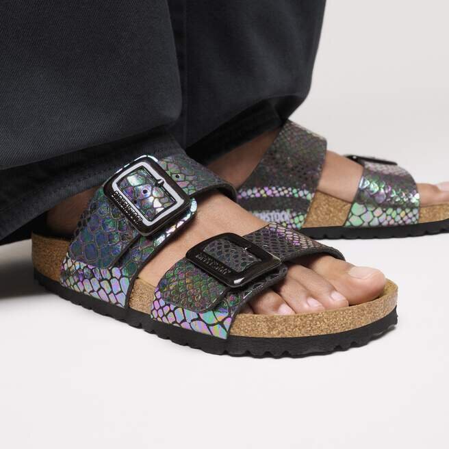 Birkenstock Sydney bevisar att mode och funktionalitet kan gå hand i hand. Med sina två enkla remmar är den en riktig hit bland kvinnor som vill ha både hög mode och komfort. Denna version kommer i ett glänsande ormmönster och utstrålar elegans och en touch av extravagans tack vare den iriserande metallfolien och ormskinnslooken. Inspirerad av naturen, ingen skor ser ut eller känns precis som en annan. De glänsande, mjukt rundade vadderade spännena är särskilt iögonfallande. Ovansidan är tillverkad av ett hudvänligt syntetmaterial.
