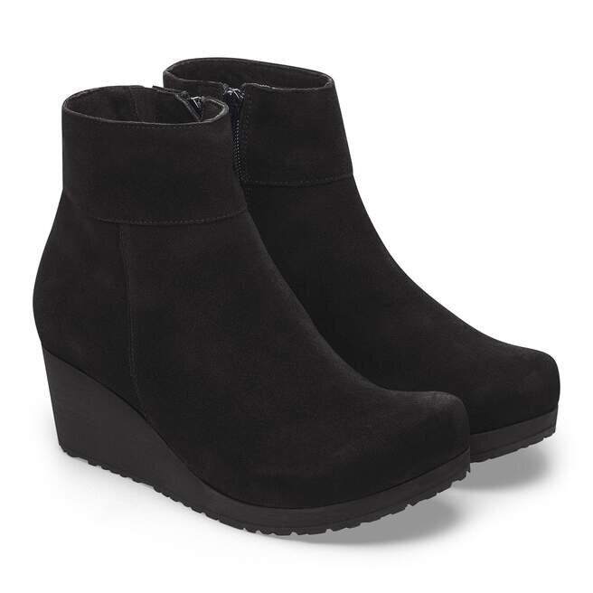Ankelstövlarna Ebba kombinerar den konturerade komforten hos Birkenstock-fotbädden med en kilklack i kork – utan att lägga tryck på framfoten. Den konturerade, dämpande fotbädden skapar anpassat stöd med användning