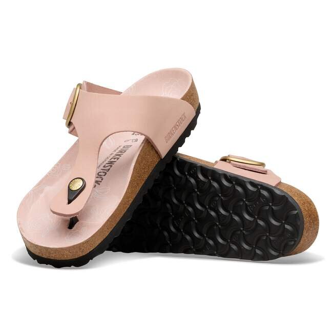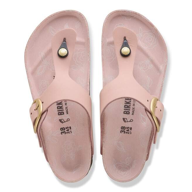 Birkenstock Gizeh är en äkta klassiker och en stilfull allroundmodell. Vår eleganta tåsandal kombinerar optimalt grepp med minimalistisk, trendig design. Versionen med stort spänne har ett stort, elegant spänne – en fantastisk, iögonfallande detalj på denna annars diskreta sandal. Denna modell har ett feminint blommönster på fotbädden. Övre delen är tillverkad av högkvalitativt, mjukt nubuckläder som har ett naturligt, rustikt utseende.