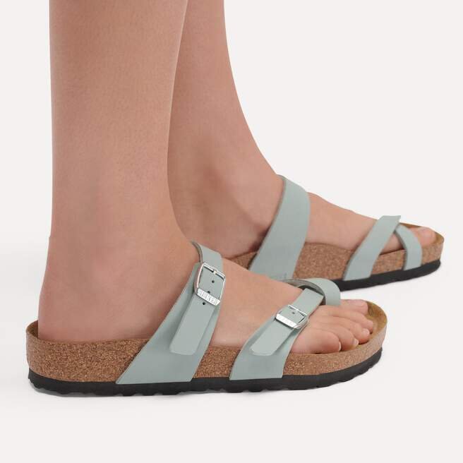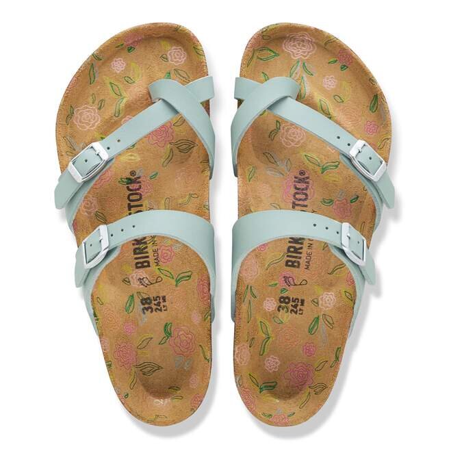 Birkenstock Mayari-tåsandal är en elegant modell med tårem. Den imponerande kombinationen av design och bärkomfort gör att modemedvetna män och kvinnor kan ta sig igenom dagen med elegans och komfort. Denna modell har ett feminint blommönster på fotbädden. Överdelen är tillverkad av det hudvänliga, slitstarka syntetmaterialet Birko-Flor® i en sofistikerad nubucklook som har en struktur och färg som nästan kan förväxlas med äkta läder.