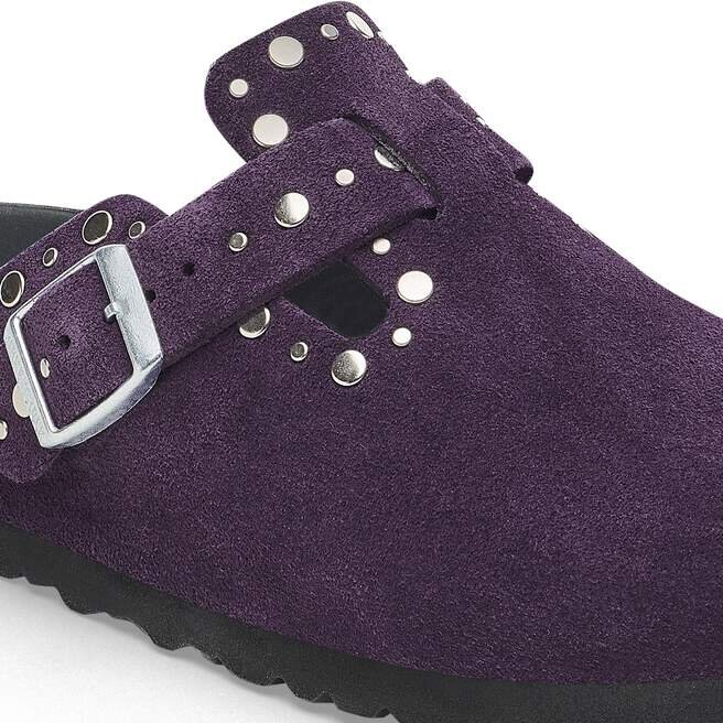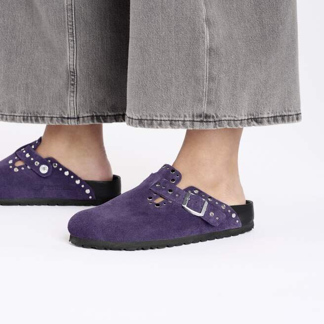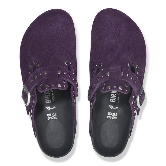 Boston-träskorna är så genomgående bekväm att de har blivit en eftertraktad favorit året runt. Metallnitar pryder den klassiska ovandelen i mocka i ett iögonfallande mönster, noggrant placerade för att undersidan ska vara slät och bekväm att bära. De vilar på en utsökt fotbädd helt fodrad i mjukt läder för en stödjande, lyxig känsla.