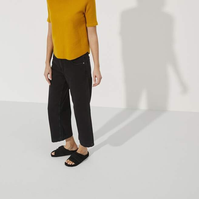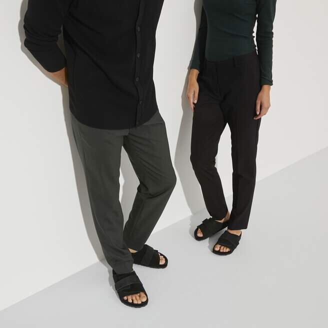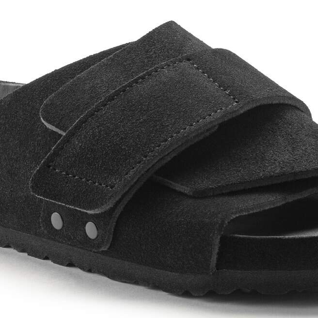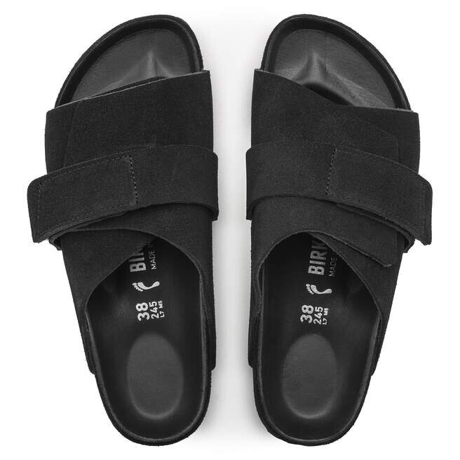 Den avslappnade Birkenstock Kyoto utmärker sig med sin omslutande design och individuellt justerbara kardborreförslutning. Detta ger denna avslappnat stilfulla sandal en passform och känsla som en toffel. Denna utsökta version har en fotbädd som är helt fodrad med lyxigt mjukt, färgmatchat läder. Överdelen är tillverkad av särskilt mjukt mocka.