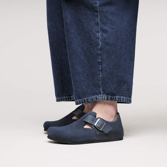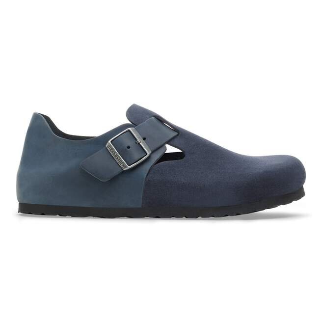 Birkenstock London är en variant av den klassiska Boston. Den upphöjda hälpartiet är karakteristiskt för denna enkla låga sko utan sömmar. Den har ett naturligt, rustikt utseende och en öppen kant, ofodrad finish. Övre delen är tillverkad av mocka i kombination med oljat nubuckläder.
