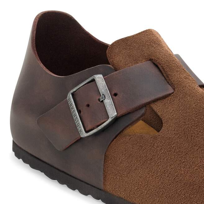 Birkenstock London är en variant av den klassiska Boston. Den upphöjda hälpartiet är karakteristiskt för denna enkla låga sko utan sömmar. Den har ett naturligt, rustikt utseende och en öppen, ofodrad finish. Övre delen är tillverkad av mocka i kombination med oljat nubuckläder.