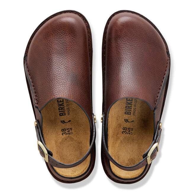 Naturläder känns igen på sin obehandlade yta. Birkenstock behandlar medvetet inte ytstrukturen och andra karakteristiska drag. Birkenstock använder robust läder med en tjocklek på 2,8 till 3,2 millimeter som överdel.